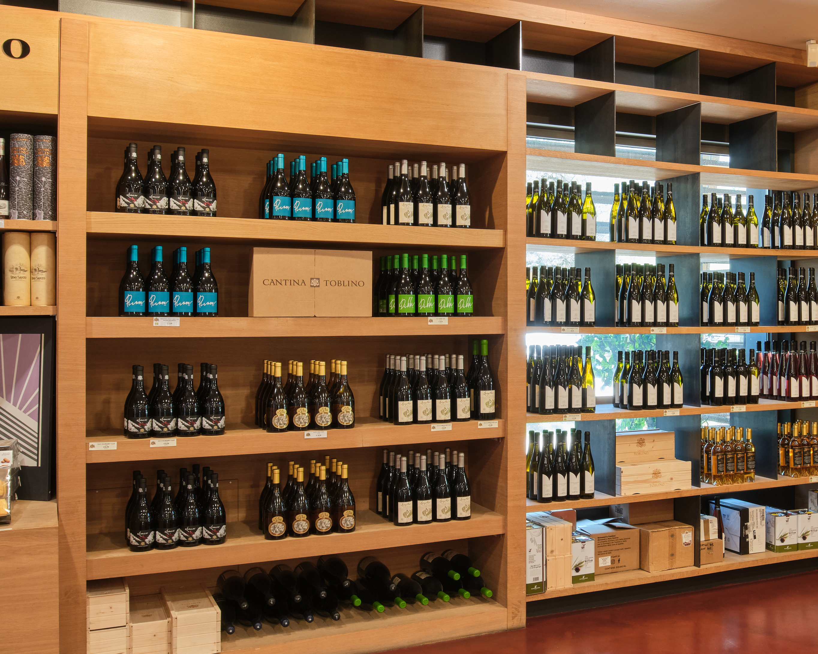 Il negozio, con scaffalature in rovere, espone anche etichette di altre cantine locali, italiane ed estere, organizzate in percorsi tematici dedicati all’eccellenza enogastronomica.